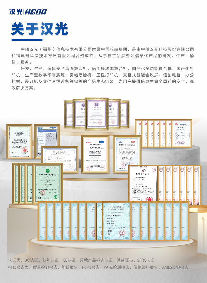 中船汉光(福州)信息技术有限公司隶属中国船舶集团,是由中船重工汉光科技股份有限公司和福建省科威技术发展有限公司合资成立,从事自主品牌办公信息化产品的研发、生产、销售、服务。研发、生产、销售安全增强复印机、信创多功能复合机、国产化多功能复合机、国产化打印机、生产型数字印刷系统、宽幅喷绘机、工程打印机、交互式智能会议屏、信创电脑,办公耗材、装订机及文件销毁设备等完善的产品生态链条,为用户提供信息生命全周期的安全、高效解决方案。公司建立了覆盖全国大陆地区的销售服务网络,现有服务商2000余家,可满足大部分县域以上区域的技术支持,做到7*24小时服务。致力于把“汉光”品牌办公信息化产品发展为中国一线办公信息品牌。